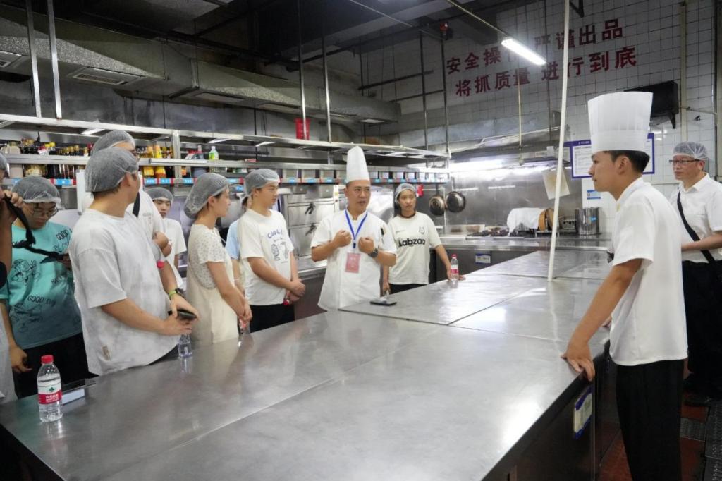 探岗行程第二站来到子云大酒店,酒店管理团队带领师生参观了宴会厨房。下午3时30分,园艺山窝窝店状元府邸店的非遗美食品鉴环节将活动推向高潮。
