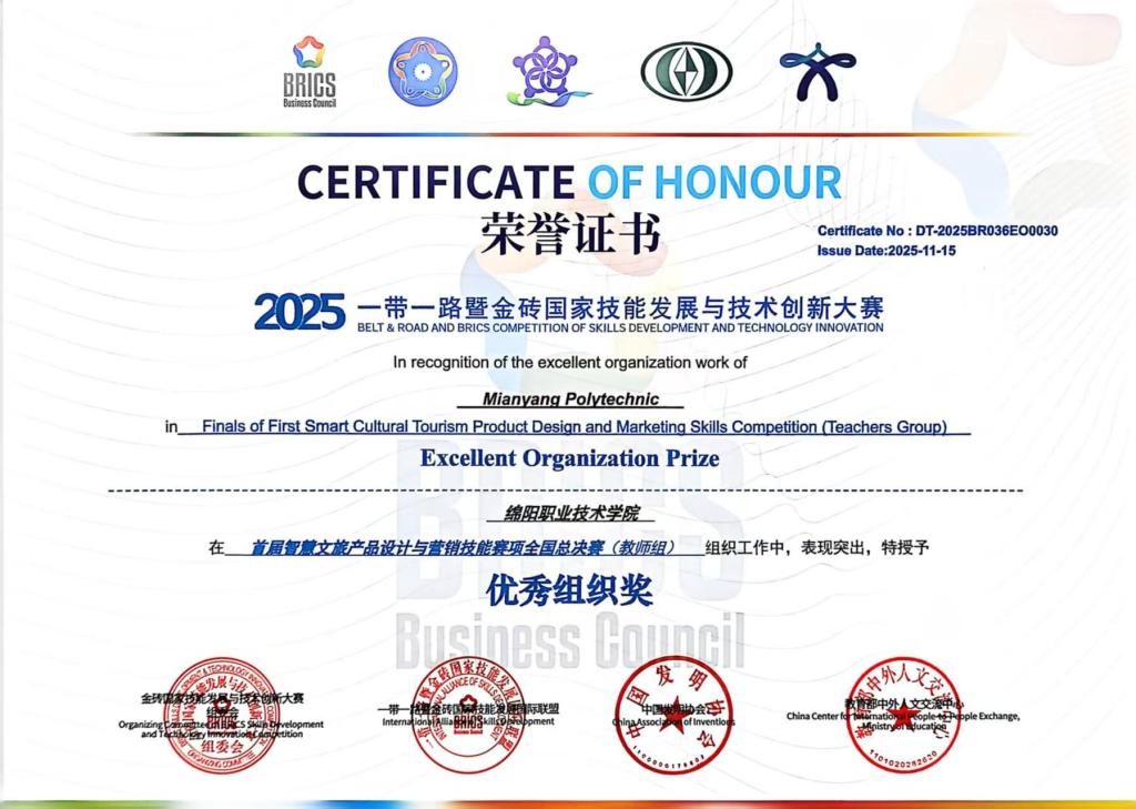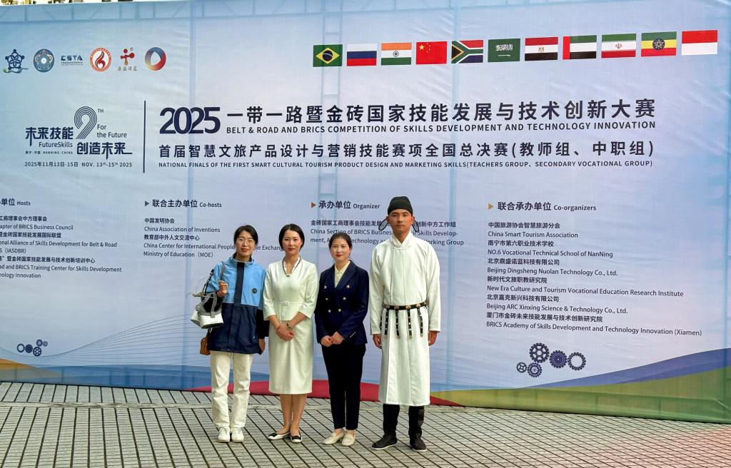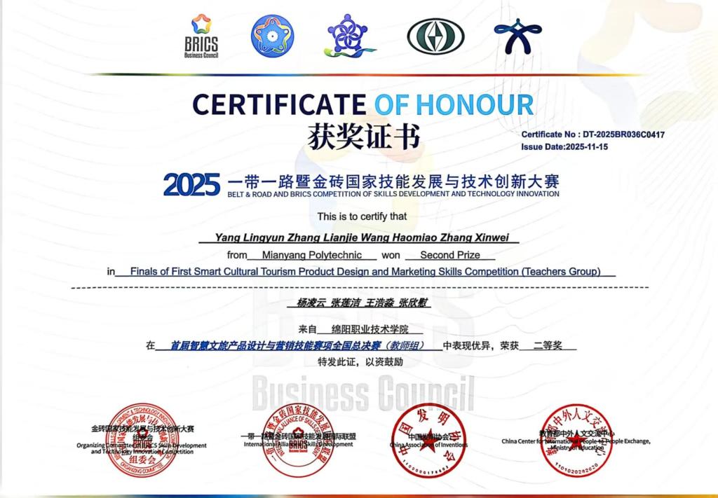 11月11日至13日,2025“一带一路”暨金砖国家技能发展与技术创新大赛首届智慧文旅产品设计与营销技能赛项全国总决赛在广西壮族自治区南宁市落下帷幕,来自全国81支队伍的300余名技能精英同台竞技。经过角逐,学院旅游管理专业群教师杨凌云、张莲洁、王浩淼、张欣慰组成的团队荣获二等奖。学校荣获优秀组织奖。