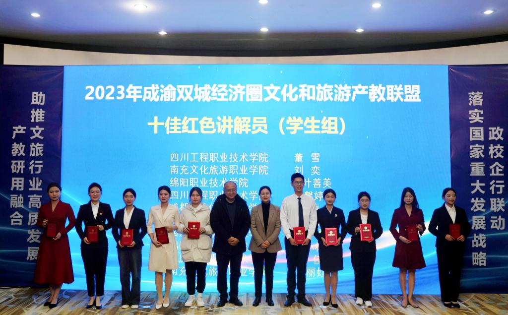 会上,参会领导为在“2023年成渝地区双城经济圈文化和旅游产教联盟红色讲解员大赛”中荣获“十佳红色讲解员”称号的同学和获得联盟行业组“十佳红色讲解员”的行业代表以及本次大赛的“优秀组织单位”颁奖。
