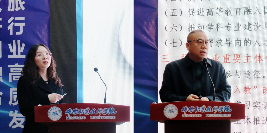 河北省三三三人才、导游专业带头人、国家级导游专业教学资源库主要参与人,《旅游市场营销》国家级精品课程负责人李翠霞副教授作《国家导游资源库建设与应用实践》专题讲座;四川文化旅游企业联盟常务副秘书长、四川旅投教育职教事业部总经理包雨作《文旅产教深入融合》专题讲座。