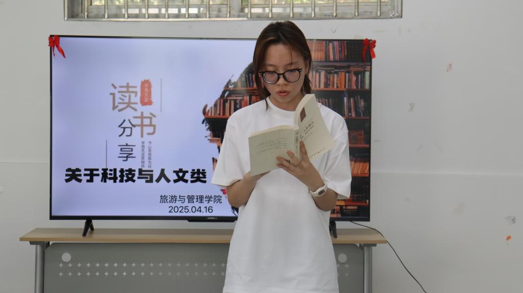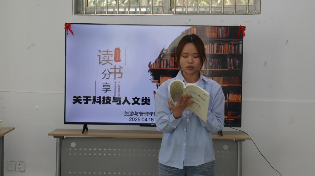 活动现场,先嘉颖、谢嘉怡、兰淇等六位同学上台分享了自己的阅读感想与领悟。先嘉颖围绕余华《第七天》,结合书中“死亡不是终点,遗忘才是”等内容,探讨了生命的意义与社会责任。她提出:“当死亡成为社会现实的镜子,我们更应该思考如何让生命更有价值”。随后进入科幻主题环节,谢嘉怡通过解读刘慈欣《超新星纪元》,分析了书中“孩童建立新文明”的设定:当成年人突然消失,孩子们在重建秩序过程中竟重现战争与权力争夺,这揭示了人类文明基因中潜藏的暴力本能。最后在励志主题单元,兰淇结合《平凡的世界》中孙少平、孙少安的奋斗故事,指出“征途漫漫,惟有奋斗”的核心精神。