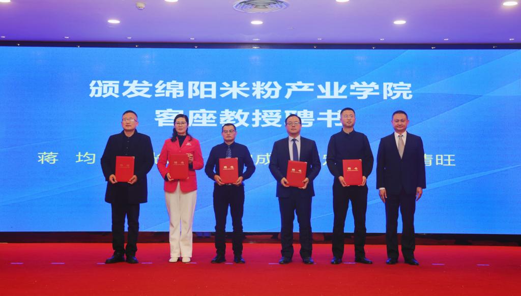 会上,袁蓉为谢小军技能大师工作室和赵小林技能大师工作室授牌,王荣海致欢迎辞并为绵阳米粉产业学院客座教授颁发聘书。